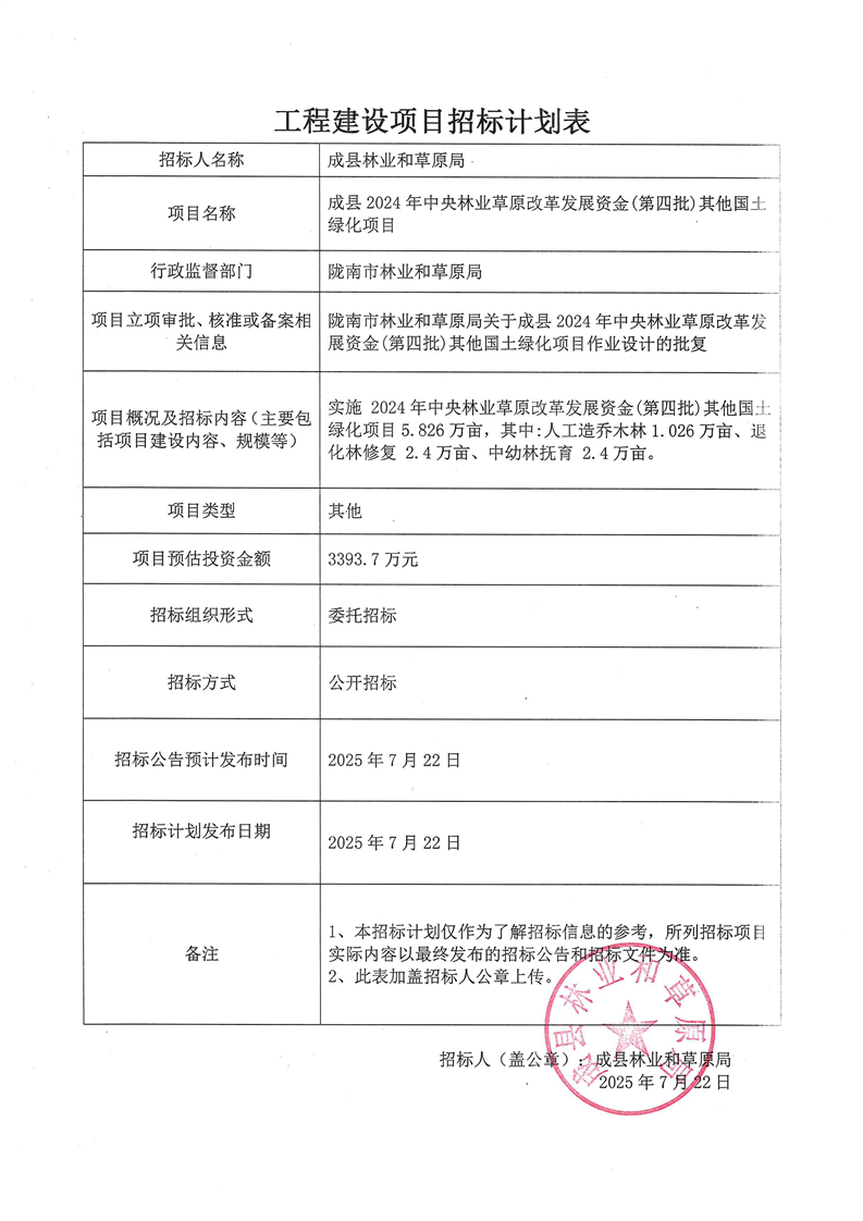 成縣2024年中央林業(yè)草原改革發(fā)展資金(第四批)其他國土綠化項目