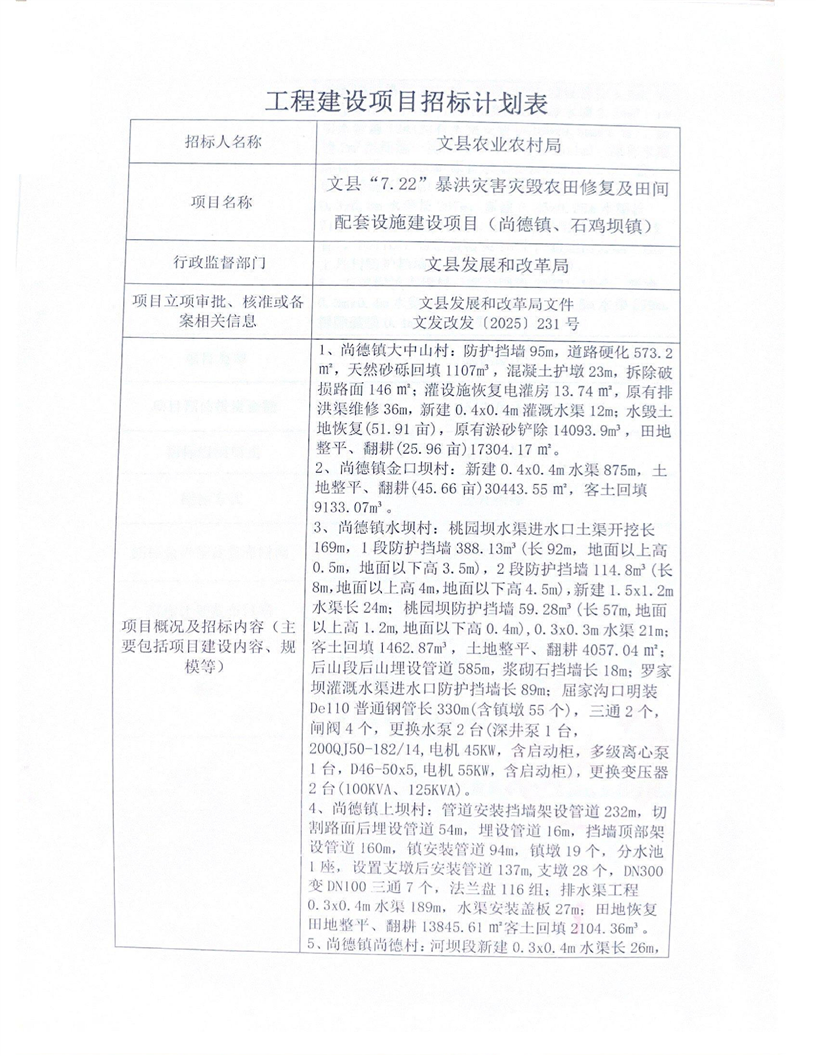 文縣“7.22”暴洪災害災毀農(nóng)田修復及田間配套設(shè)施建設(shè)項目(尚德鎮(zhèn)、石雞壩鎮(zhèn))