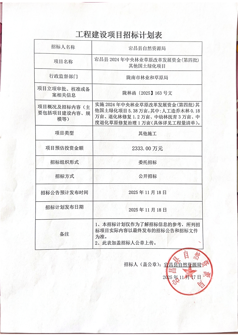 宕昌縣2024年中央林業(yè)草原改革發(fā)展資金(第四批)其他國(guó)土綠化項(xiàng)目