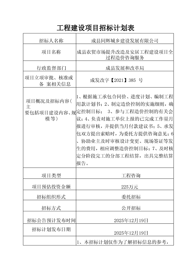 成縣農(nóng)貿(mào)市場(chǎng)提升改造及安居工程建設(shè)項(xiàng)目(一期)全過(guò)程造價(jià)咨詢(xún)服務(wù)