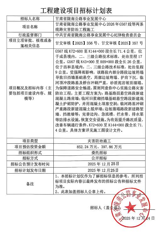 甘肅省隴南公路事業(yè)發(fā)展中心2026年G567線等兩條線路災害防治工程施工