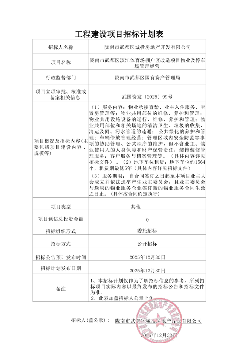 隴南市武都區(qū)濱江體育場棚戶區(qū)改造項目物業(yè)及停車場管理經營