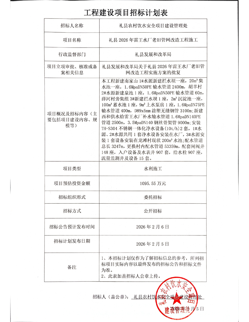 禮縣2026年雷王水廠老舊管網(wǎng)改造工程施工