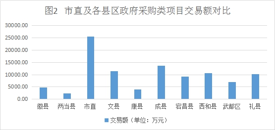 2.政府采購(gòu)類項(xiàng)目:市直45項(xiàng),交易額25563.29萬(wàn)元;武都區(qū)36項(xiàng),交易額6990.89萬(wàn)元;成縣34項(xiàng),交易額13577.85萬(wàn)元;徽縣20項(xiàng),交易額4778.48萬(wàn)元;西和縣34項(xiàng),交易額10655.60萬(wàn)元;禮縣35項(xiàng),交易額10150.20萬(wàn)元;康縣23項(xiàng),交易額3886.56萬(wàn)元;文縣36項(xiàng),交易額11436.30萬(wàn)元;宕昌縣35項(xiàng),交易額9173.00萬(wàn)元;兩當(dāng)縣14項(xiàng),交易額2284.08萬(wàn)元。